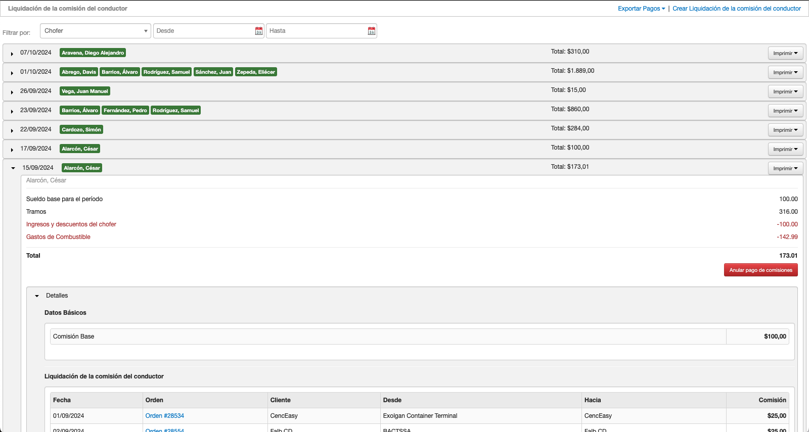 Administra perfiles, contratos y documentos de choferes y contratistas. Liquida comisiones, gastos, deducciones, cuotas y reembolsos, considerando mínimos e ingresos fijos. Exporta a tu software contable, y genera informes personalizados.